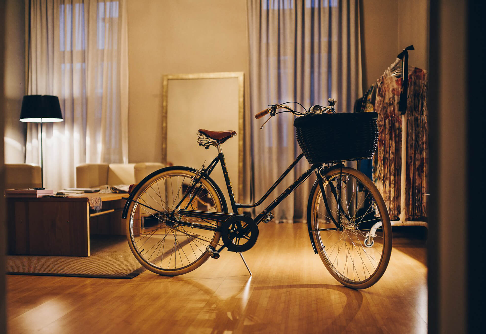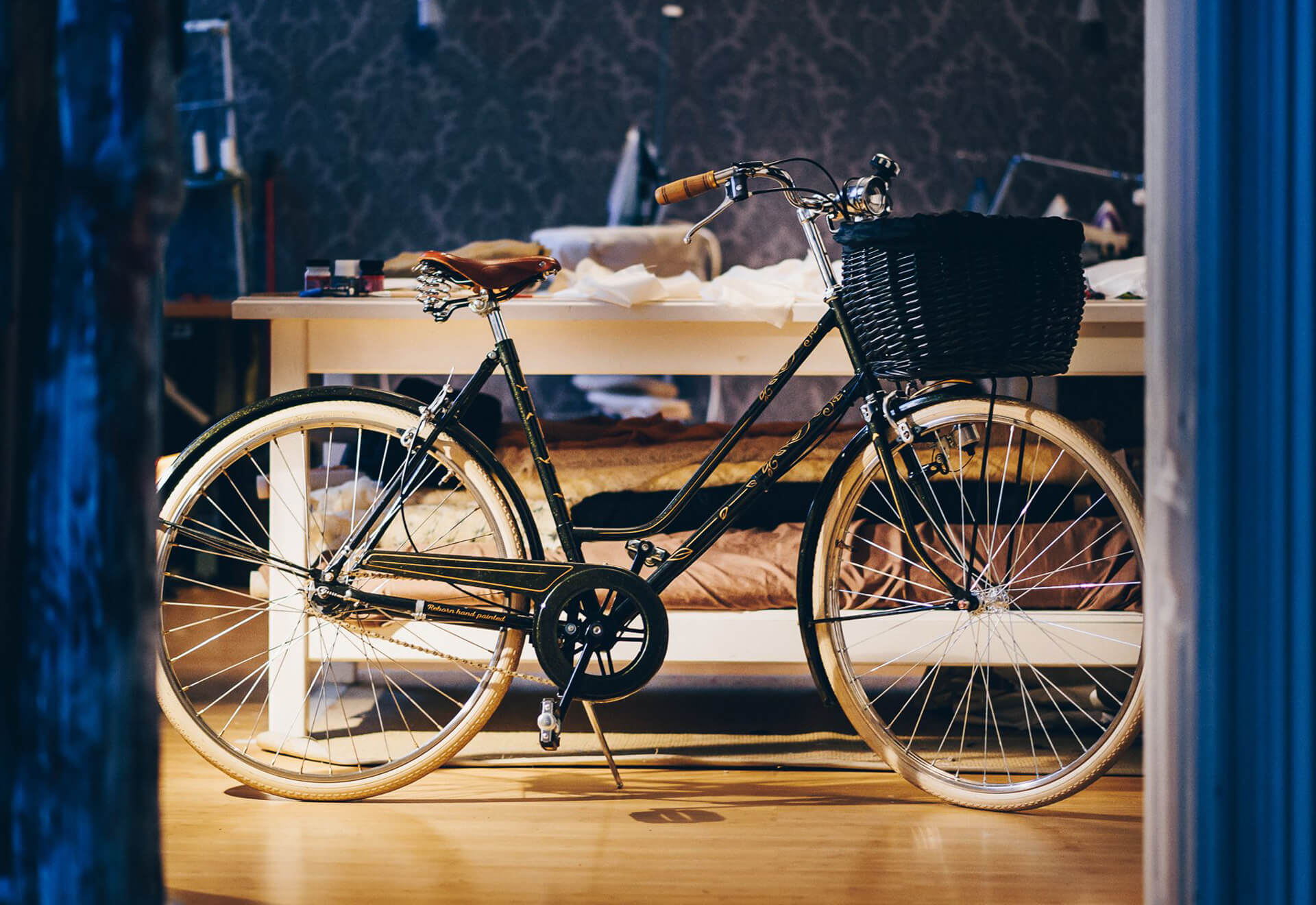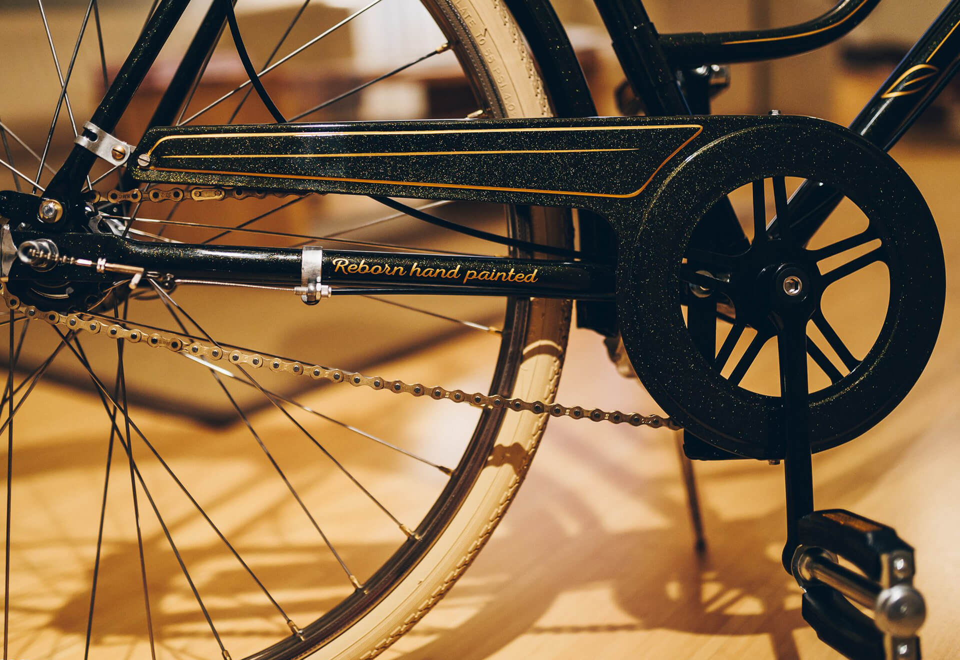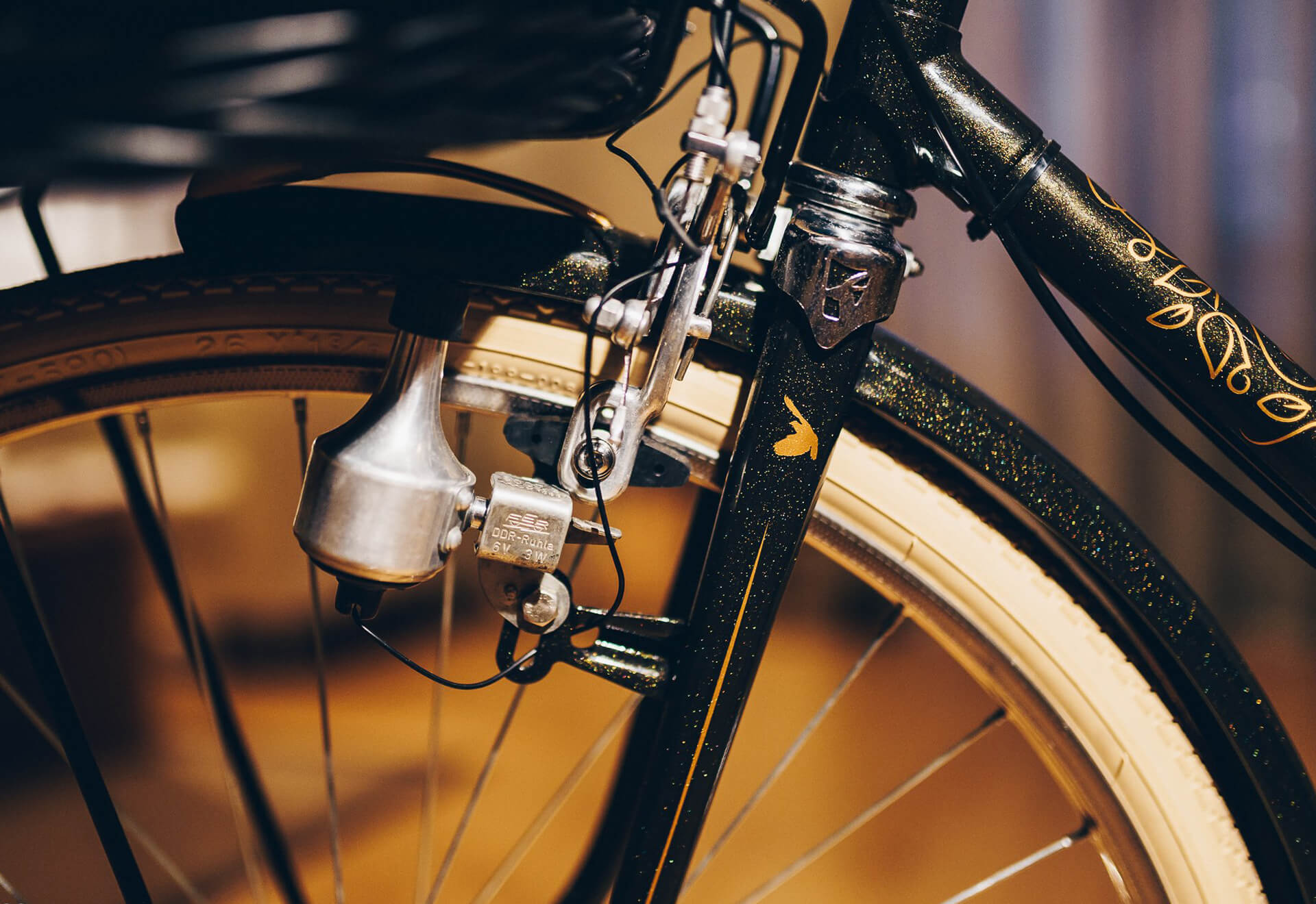 Gazelle '79. This should be enough said. The other following words are just to give you a perspective of what happened here. This bicycle was a mess when it came into our shop. From the minute we set eyes on it we knew this will be a breaker. Tearing it to parts we realized that this is not going to be an easy job and that we are missing some pieces from the puzzle. This bike was built to stay in style so we kept everything under control and went just a little loco.We threw some golden flakes in the paint job, and while we had flakes and gold, India was knocking at the door, so we got inspired by henna drawings and made some swirling designs on the tubes. The doves came in handy for designing a bicycle for somebody that makes fashion design . Classic cream tires, Brooks saddle and a nice big basket in black. This was a special project that turned into a special gift!