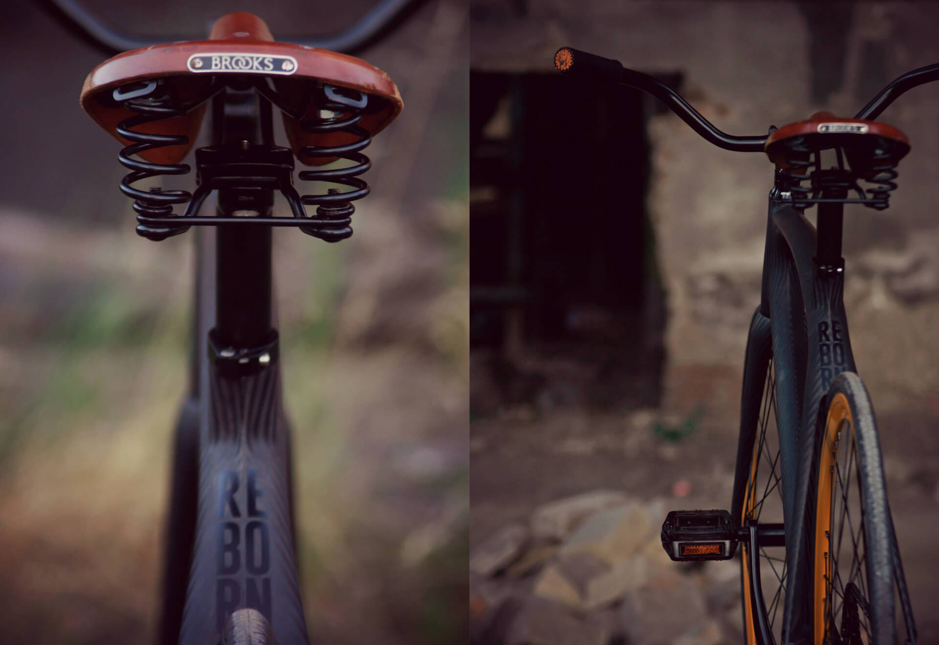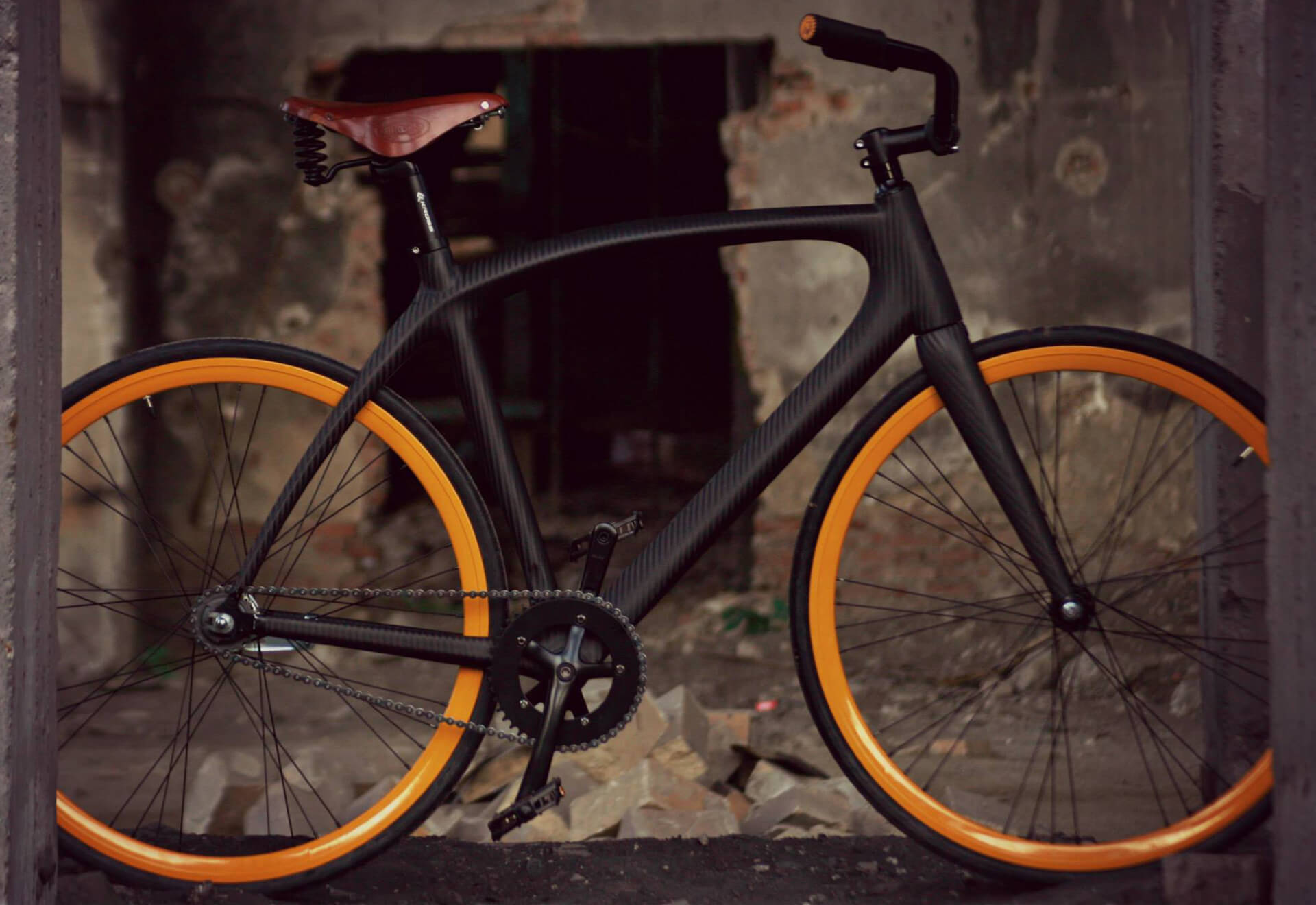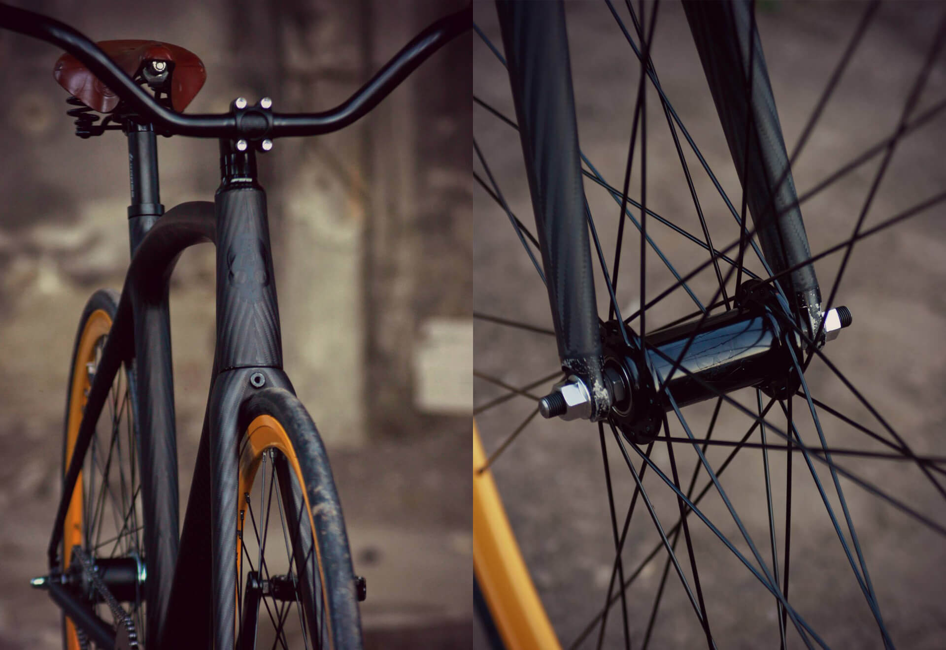 Umberto Palermo designed this full carbon city beauty. Ultra light and easy to carry arround. Our friend wanted a little self character, so we came up with some yellow rims and all black accesories for contrast, as detailing we've engraved his sweet dog friend on the leather grips. In the end the bike is a clean cut job.